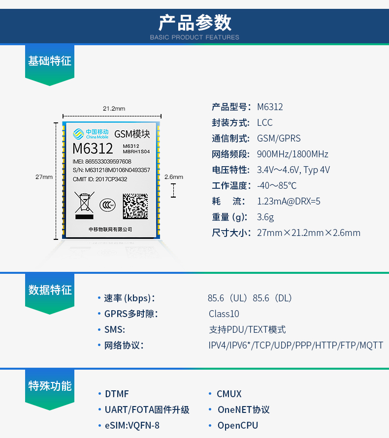 中國移動OneMO GSM/GPRS物聯網無線通信模塊M6312 2G模組